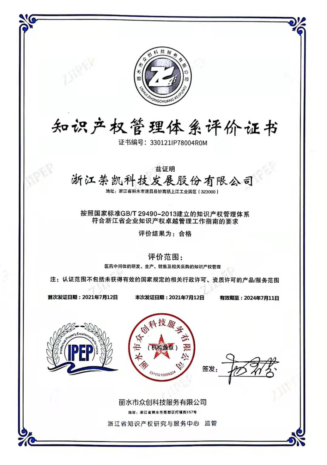 知识产权认证证书